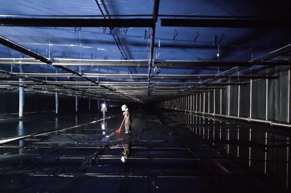 WCDA水池总面积达78000㎡,由两个150m×150m的水池和一个300m×110m的水池共同组成,其特有的“薄壁混凝土现浇边墙+软基土工膜防渗系统+大跨度轻钢屋面结构”设计在国内实属首创,在国际也属领先设计。在没有国标可参考的情况下,水池参建各方实现了“总水量日变化率≤0.01%、水体温度日变化率≤0.02°的优异防渗漏及保温效果;22500平方米和33000平方米的单体建筑实现光学密闭,保证池内高灵敏度20吋光电倍增管得以在单光子水平下进行测量、池内整体的聚脲防腐体系确保超过80000平方米的钢结构、轻钢屋面在饱和水蒸气环境下长期不生锈。这些高水准的工艺指标,是确保池内水质能够长期保持12米以上的紫外光衰减长度、稳定开展科学观测的必要条件,且通过了1#装置和2#装置的运行稳定性检验。