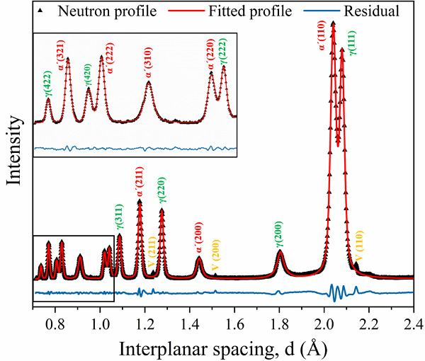 D&P钢中的晶相存在大的畸变、缺陷、择优等,对中子衍射数据要求高,GPPD的高分辨率和良好衍射峰型保证了本研究所需的数据质量。同时,GPPD为消除择优等因素对数据分析的影响,为本类实验专门设计了旋转样品杆。GPPD是中国散裂中子源首期期建设的三台谱仪之一,自2018年运行开放以来,已经顺利完成近90项用户课题研究,多项用户实验成果已在Science、Nature Communication、Advanced Materials等期刊发表。