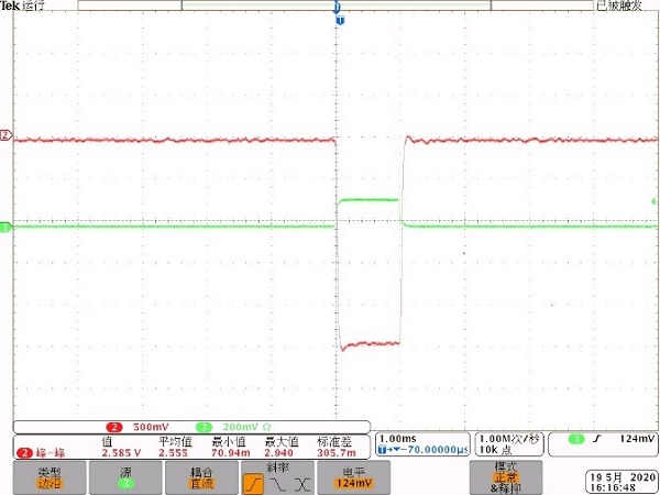 电子枪出口流强测试(绿色为激光脉冲触发信号/红色为束流信号)