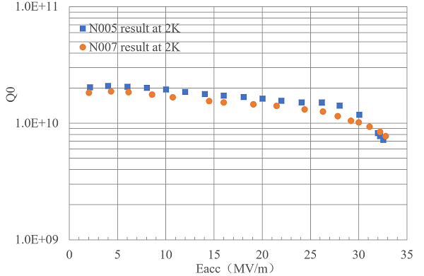 7月24日、30日,中科院高能所两只带端腔组件的1.3GHz 9-cell细晶粒超导腔经2K温度下测试显示:加速梯度分别达到32.8MV/m和32.6MV/m,其品质因子Q0在30MV/m下均超过1×1010。这一测试结果是我国目前完全自主研发的细晶粒1.3 GHz 9-cell超导腔的最好结果,它实现了国内细晶粒超导腔指标跨越性进步,并与国际直线对撞机(ILC)超导腔指标35±20% MV/m(28 MV/m到42 MV/m)@ 8×109的国际水平接轨。