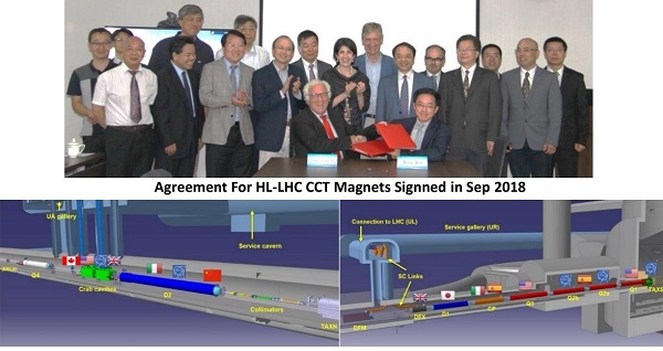 图1. 上)2018年9月,中国团队与CERN签订HL-LHC CCT磁体相关合作协议; 下)HL-LHC项目中不同国家承担的超导磁体研制任务分布。