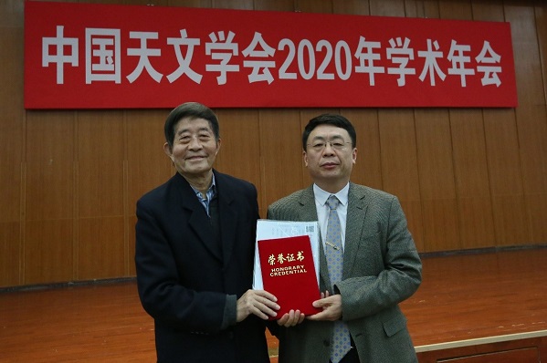 10月12日,中国天文学会2020年学术年会在北京师范大学召开。开幕式上,中科院高能所粒子天体物理中心王建民研究员获颁中国天文学会第四届“黄润乾天体物理基础研究奖”(以下简称黄润乾奖),中国科学院周又元院士与李惕碚院士为其颁奖。颁奖仪式后,王建民做了“反响映射观测:从黑洞质量到宇宙学距离测量”的大会邀请报告。