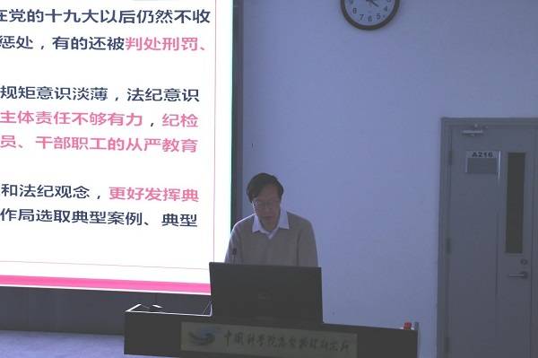 随后,罗小安传达了以下案例与相关问题:中科院直属机关纪委通报的2018年以来查处的中科院党员干部违纪违法典型案例、中科院条财局通报的经费使用典型问题、中科院国家合作局通报的出国(境)典型问题、中央纪委国家监委通报的问责典型案例。罗小安要求全体党员和干部职工以案为鉴,筑牢拒腐防变的思想防线;各相关职能部门以通报问题举一反三,即知即改,切实履行管理责任。