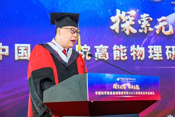 王贻芳首先代表高能所向完成硕士和博士学位的同学们表示祝贺,向悉心指导他们的导师表示感谢,并感谢各位同学在高能所科研中付出的卓越努力,希望大家记住在高能所奋斗的这段珍贵的人生经历,殷切希望同学们把高能精神带到工作岗位,在前进中不忘初心、成为担当民族复兴大任的时代新人。