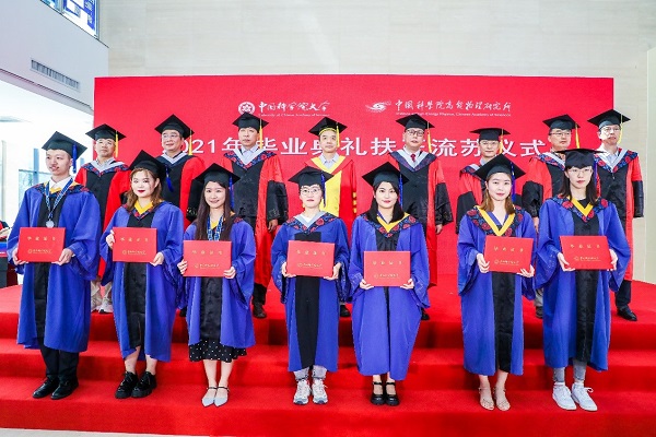 典礼上,王贻芳为院长奖获得者代表和优秀毕业生代表颁发荣誉证书,常哲为2021届校友联络人颁发聘书。