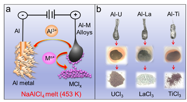 图1. 基于NaAlCl4 熔盐电解分离的新方法:(a)阳极原位沉淀过程示意图;(b)不同的合金阳极,对应的金属氯化物沉淀在坩埚底部,及最终得到的金属氯化物产品