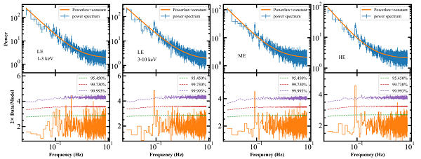 慧眼卫星三个仪器低能、中能和高能探测器对毫赫兹准周期振荡信号的独立探测(摘自Yan, Rappisarda & Yu, 2021, ApJ,919,46)。