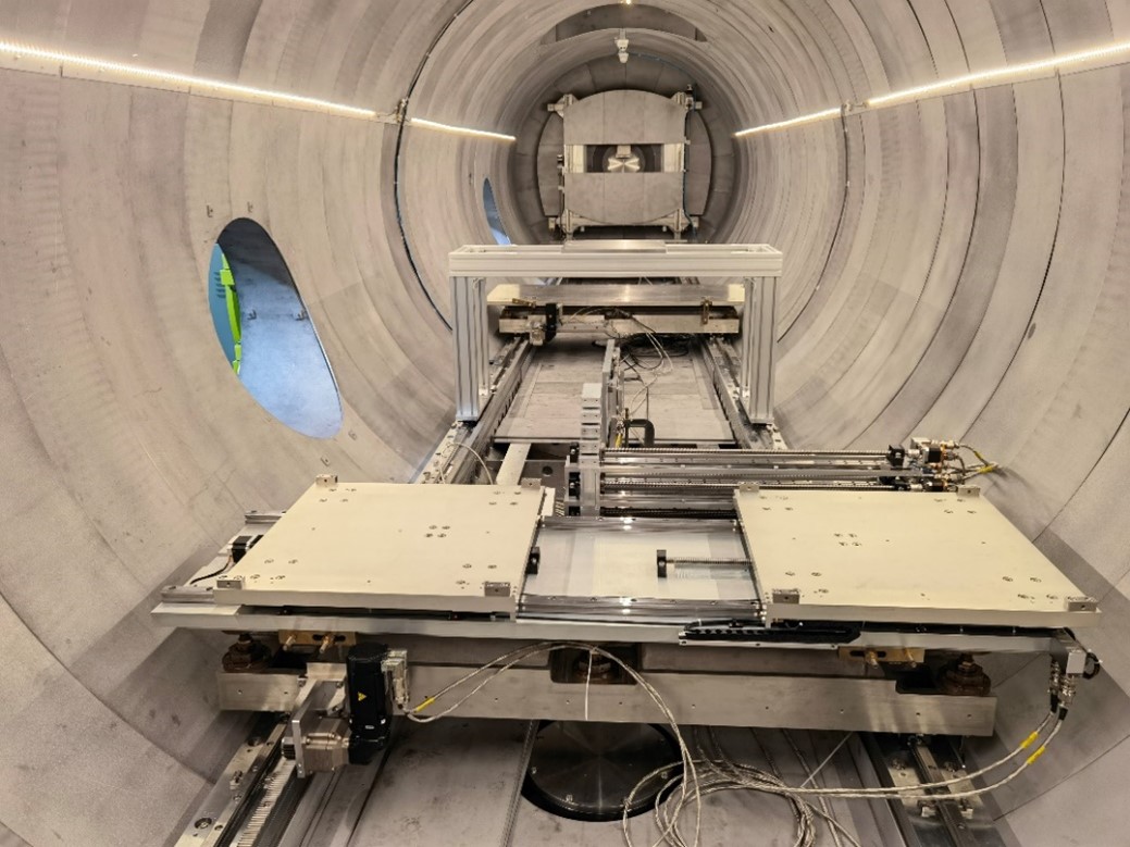 微小角中子散射谱仪的散射腔内径2.6米,总长12.75米,总重22吨。散射腔内设置导轨和三个探测器小车,要求左右导轨平行度小于0.05毫米,顶面高差小于0.2毫米,以保证小车运行平稳和探测器位置精度。在微小角中子散射谱仪团队的精心设计和四川九天真空团队的密切配合下,散射腔系统历时12个月,顺利完成工艺设计、加工制造和出厂测试验收。测试结果表明,左右导轨平行度优于0.04毫米,顶面高差小于0.16毫米,满足设计要求。