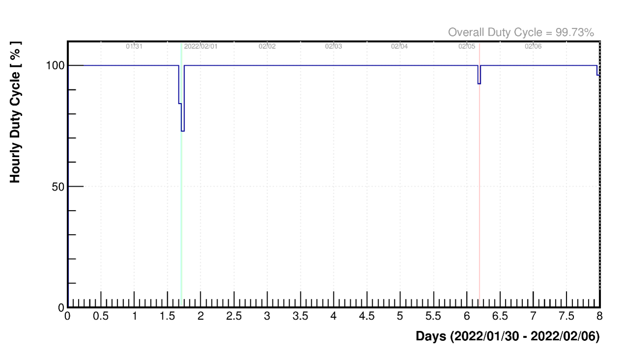 稻城高海拔极寒天气和频繁降雪给每日的通勤、场地巡检和设备运行等造成了很大的困难,但KM2A和WCDA仍然稳定运行,春节期间维持了超高的duty cycle(有效运行时间)约99%。春节期间一周内,KM2A大约积累了1.57*10^9,即约为15.7亿个事例,WCDA大约积累200亿个宇宙线事例。WFCTA除了除夕夜休息未运行,春节期间每晚都在进行观测,尽管受春节期间降雪过多影响,但也完成了一半时间的观测,积累了大量宇宙线事例。