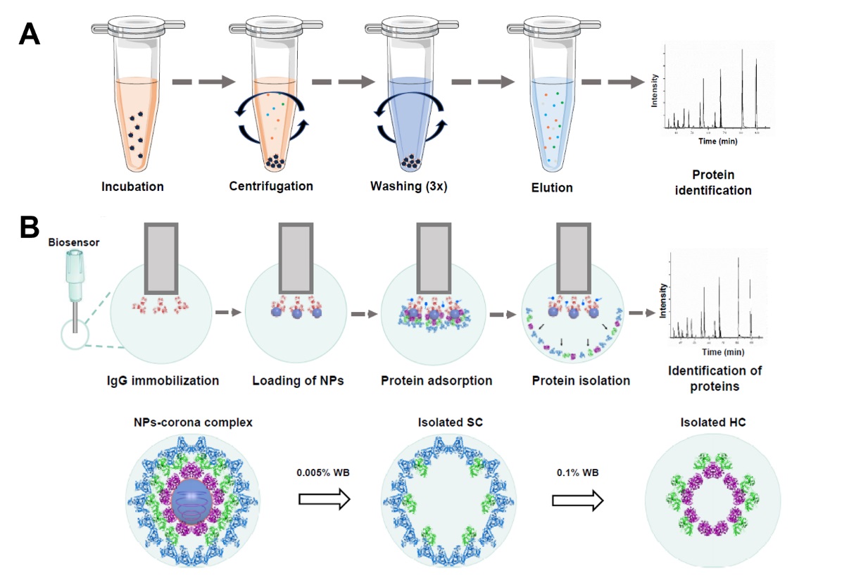 图.纳米颗粒表面多层蛋白冠原位分析方法与传统分析方法的区别。(A)传统离心法,(B)本研究开发的多层蛋白冠原位、动态分析方法。