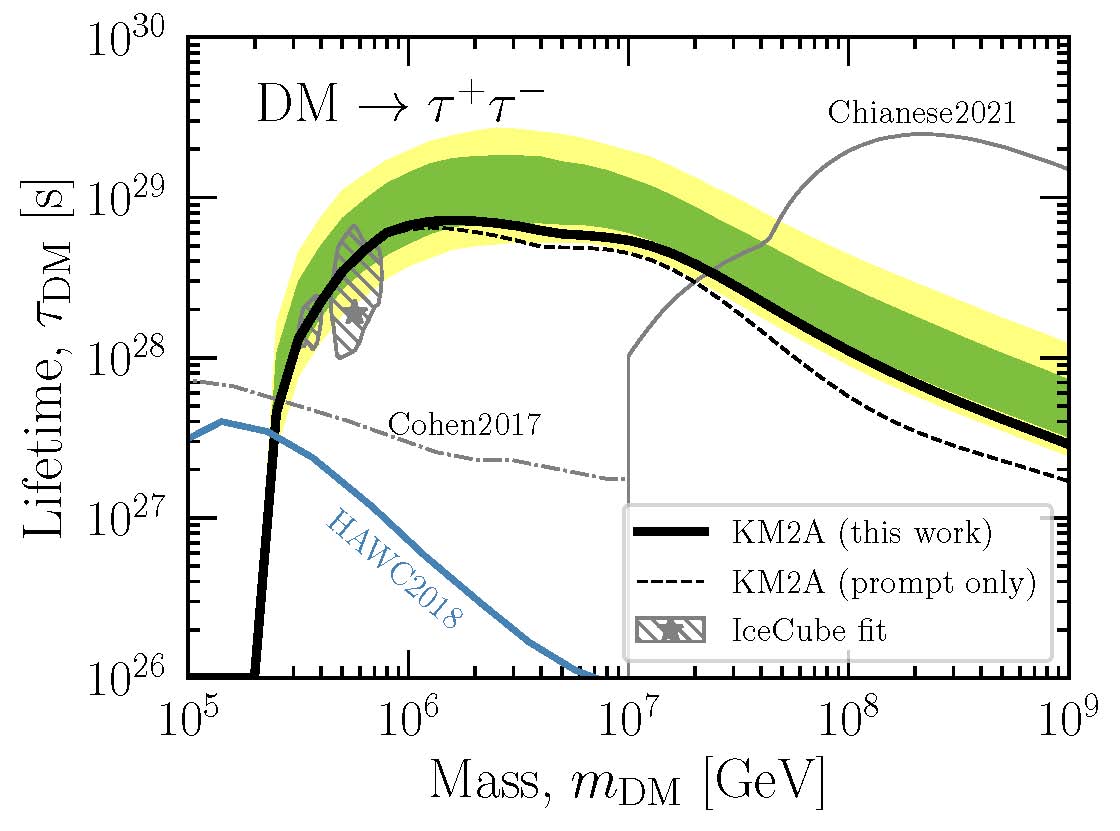 LHAASO对超高能伽马射线具有前所未有的高探测灵敏度,为研究质量超过 100 TeV 的重暗物质提供了独特的可能性。研究人员利用LHAASO在 570 天运行中KM2A子阵列获得的数据,测量了银河系盘面以外100 TeV以上伽马射线的强度,以最优的观测灵敏度,对这类暗物质的寿命做出了迄今最强烈的限制,比已有结果提高了近10倍。此项研究表明,PeV 质量暗物质寿命至少为十万亿亿年(10^21年)。LHAASO对伽马射线的观测,与其它寻找暗物质的实验(如中微子观测实验)有很强的互补性。随着LHAASO全阵列稳定运行,数据逐渐积累,将进一步提高这一限制。