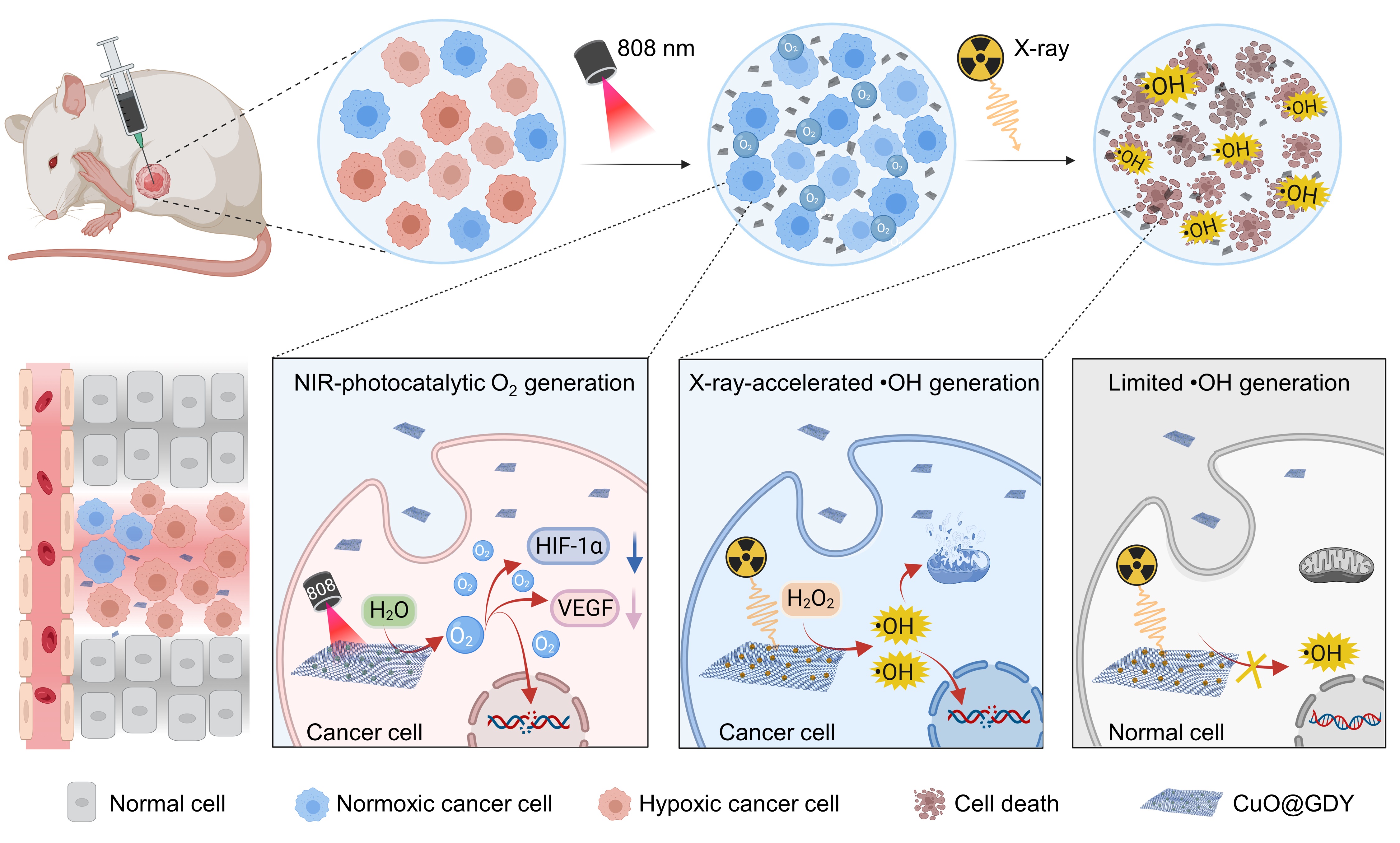 该工作设计并原位合成了Z型CuO@GDY异质结,通过同步辐射X射线吸收精细结构谱学(XAFS)揭示了异质结中Cu-C成键结构,进一步结合其能带结构揭示了其放射增敏机制。研究表明:一方面,石墨炔作为本征半导体,其能带位置与近红外光(NIR)催化析氧的能级匹配,使得Z型CuO@GDY异质结在近红外光激发下获得更快的电子与空穴(e--h+)的分离,从而在肿瘤内部可控且高效地将H2O分解产生O2,克服了乏氧肿瘤的辐射抗性。另一方面,X射线触发的水合电子使得CuO@GDY产生了大量一价铜(Cu+)活性位点,这一活性位点促进了类芬顿反应的发生,使肿瘤内部高表达的H2O2催化产生更多的羟基自由基(·OH),从而增强了对肿瘤的治疗效果。同时,因正常细胞内H2O2明显不足,·OH的产生受阻,因此对正常细胞的毒性较小。这种双催化协同作用在细胞和活体层面都得到了证实。该工作不仅提出了一种可控且高效的近红外光催化瘤内供氧策略,而且还开发了一个时空可控的辐射催化平台,为解决放射治疗过程中肿瘤组织的辐射抗性和正常组织的损伤等难题提供了新思路。
