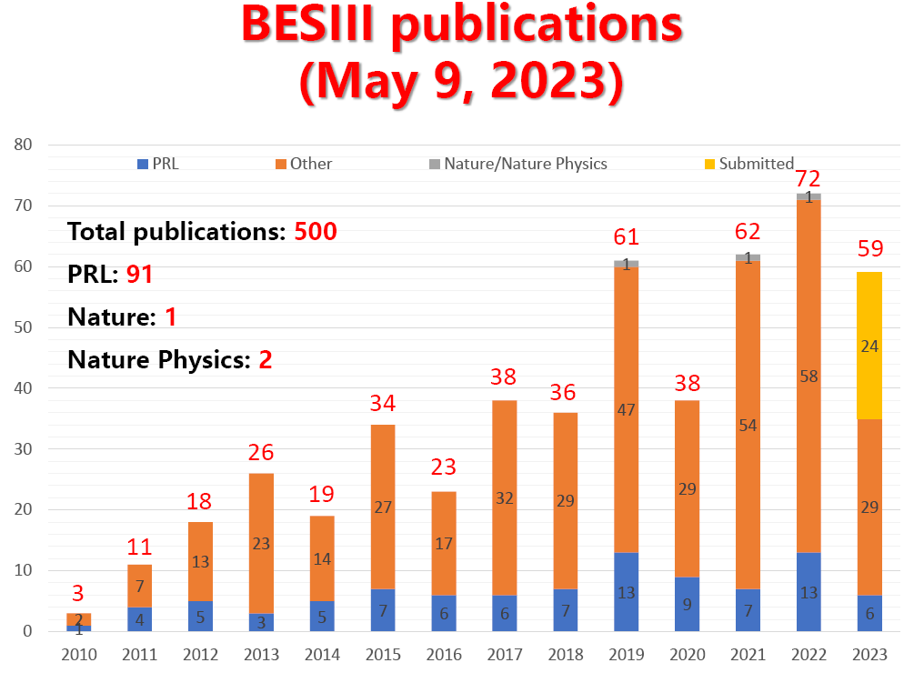 2023年5月9日BESIII合作组投稿了第500篇论文,这标志着BESIII实验完成了一个新的里程碑。BESIII合作组论文列表详见BESIII合作组网站(链接)。2023年5月31日,在中科院高能所召开了庆贺北京谱仪III合作组正式投稿500篇论文学术研讨会。会议由中科院高能所沈肖雁研究员主持,高能所所长王贻芳院士作大会开场致辞。赵光达院士、郑志鹏研究员、陈和生院士、张肇西院士、罗民兴院士、高原宁院士、李金研究员、张闯研究员、祝玉灿研究员、何小刚教授、黄涛研究员、马建平研究员、娄辛丑研究员、梁作堂教授、刘峰教授、冒亚军教授、郑海扬教授、Fred Harris教授和Steve Olsen教授等参会并发言祝贺。曹俊副所长、罗小安副所长等所领导也参会祝贺。来自国内外的高能实验家和理论家约240多人通过线下和线上的方式参会。
