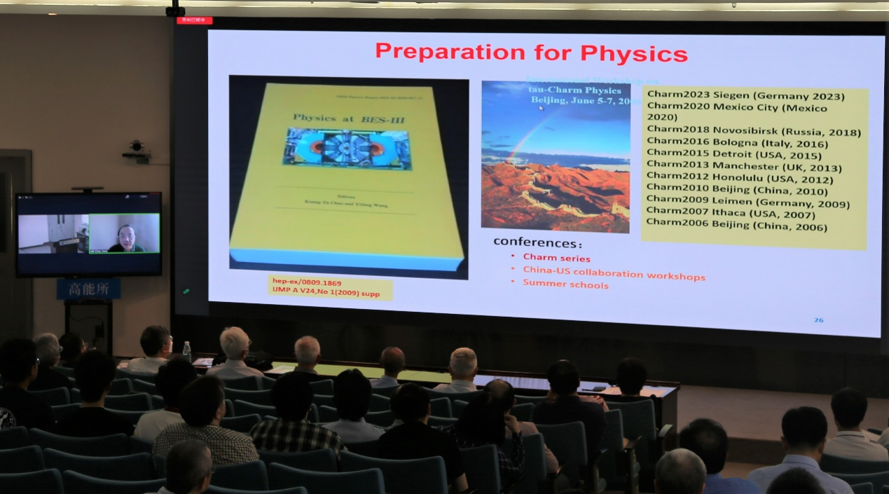 首先,王贻芳院士作了“BESIII的设计、建造和运行”的开场报告,他回顾了BESIII探测器设计、建造和物理黄皮书的研究历程, 回顾并致谢了以李卫国研究员为代表的,为探测器设计和建造过程作出突出贡献的科研和技术人员。 随后,专程由美国抵京参会的Fred Harris 教授报告了从第一代北京谱仪到第二代、第三代北京谱仪的发展历程。美籍Steve Olsen教授通过线上参会即席发言,他赞扬了北京谱仪实验所取得的成绩。他评价北京谱仪实验见证了中国的高能物理实验从无到有,到现在蓬勃发展的整个历程。郑海扬教授、郭奉坤研究员和陈莹研究员作为理论家代表也分别阐述了BESIII 实验结果对理论模型的重要意义。此外,各主题报告人与参会代表也回顾了BESIII实验组取得的重要成就,并对未来实验计划做了讨论和建议。BESIII国际合作组发言人李海波研究员最后作大会总结发言。