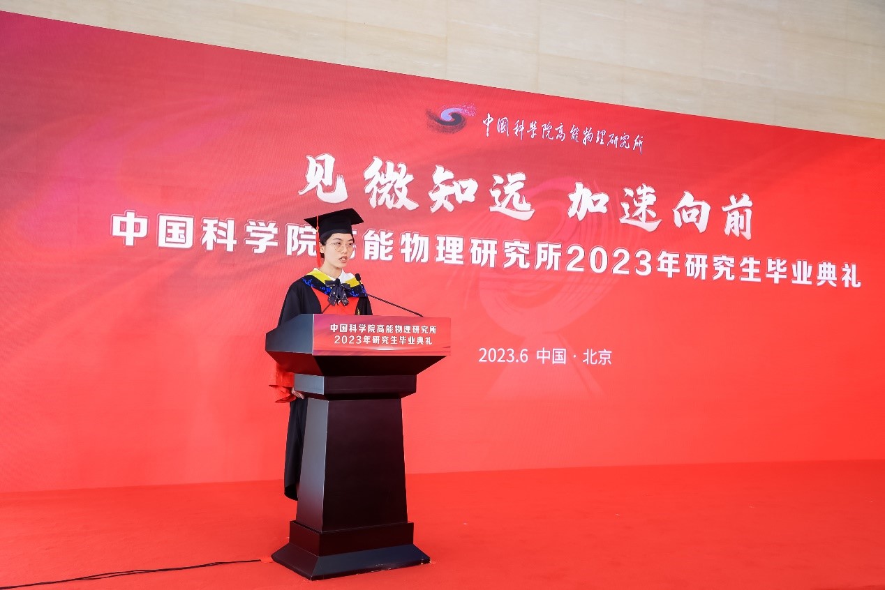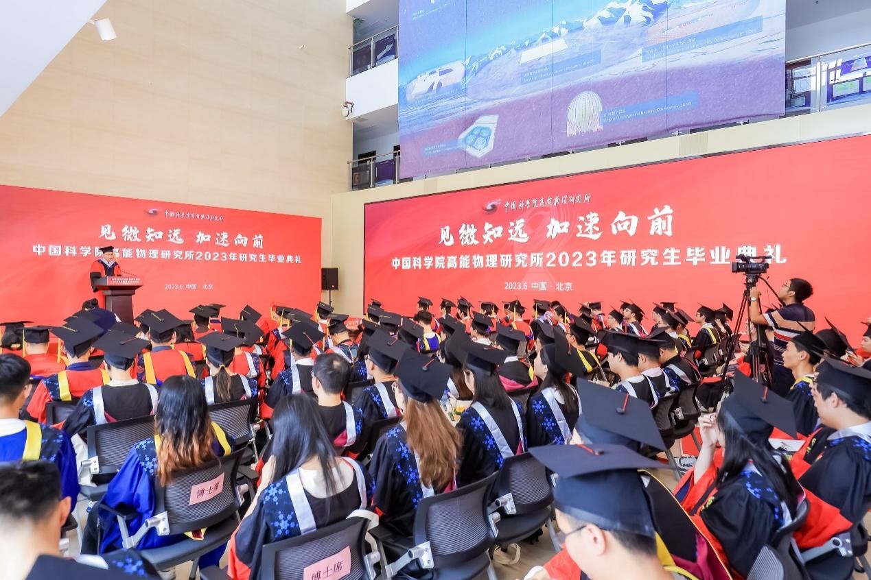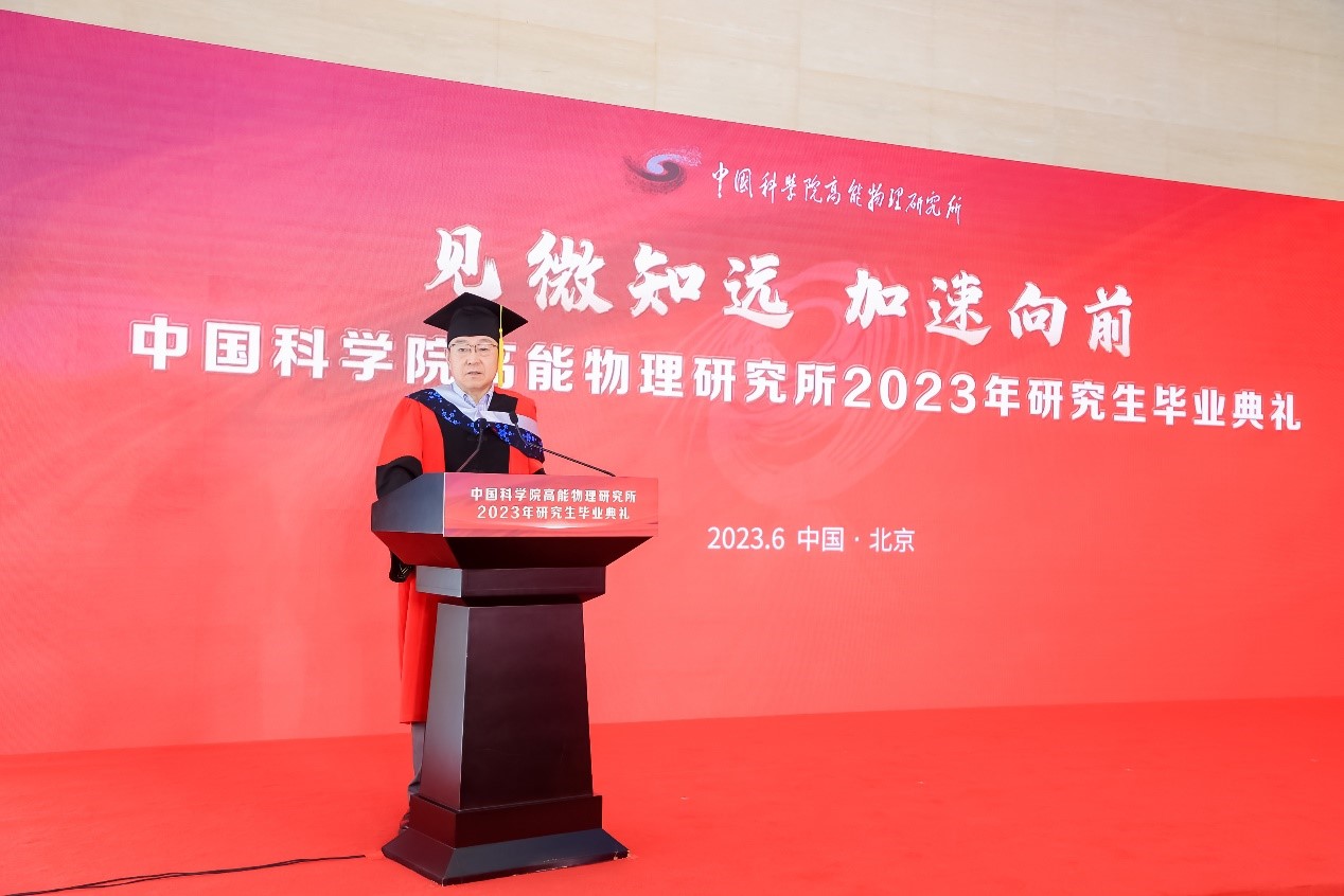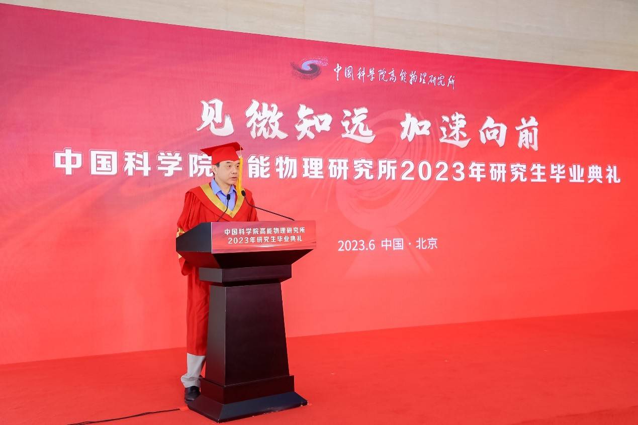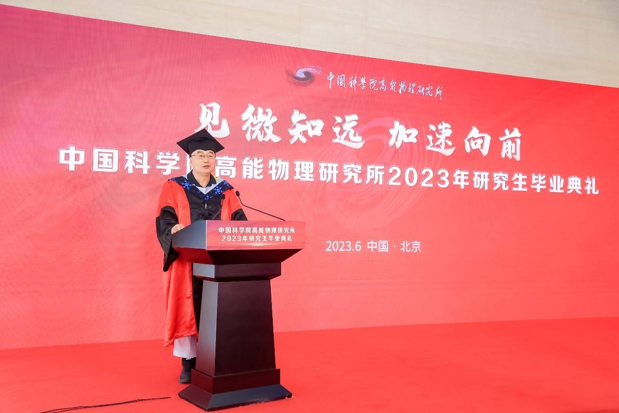 见微知远,加速向前。6月25日上午,快盈v32023年研究生毕业典礼隆重举行。所长王贻芳,党委书记魏龙,党委副书记、纪委书记罗小安,副所长曹俊、李煜辉,学位评定委员会主任常哲等出席毕业典礼。各研究中心领导、导师、毕业生及亲友们共同见证了这一重要时刻。魏龙主持典礼仪式。