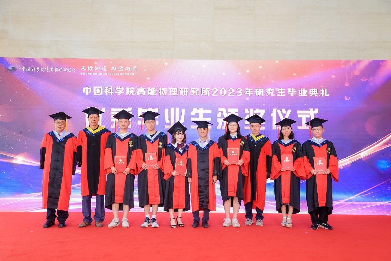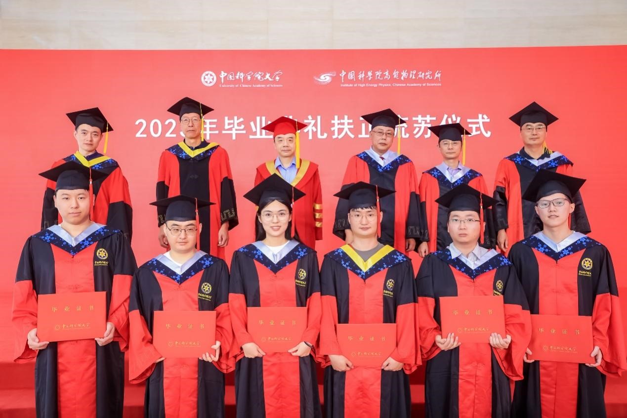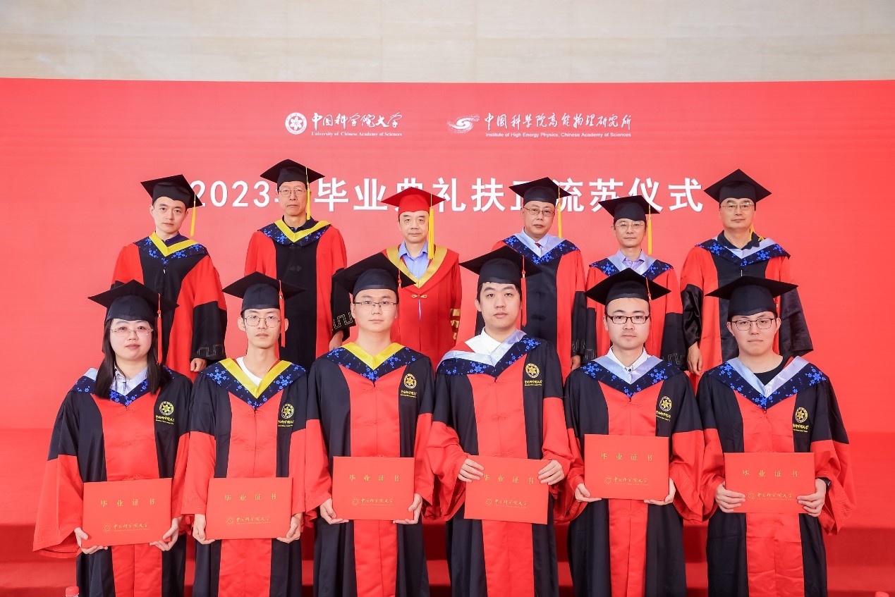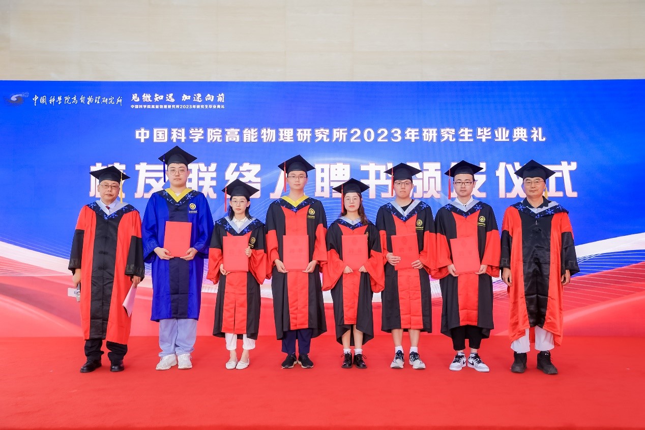 典礼上,王贻芳为院长奖获得者代表颁发荣誉证书,罗小安、曹俊、李煜辉为北京市优秀毕业生获得者颁发荣誉证书,常哲为2023届校友联络人颁发聘书。随后,所领导为毕业生们颁发毕业证书,扶正流苏。