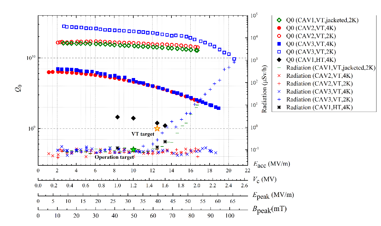 测试结果表明:在4 K温度下,加速电压达到HEPS运行值1.2 MV时,166 MHz超导模组的品质因数达到1.4E+9,模组4 K下的动态热负载为7.4 W,无场致发射。加速电压在1.6 MV时,模组的品质因数达到1.1E+9。在腔内峰值电场达到42.7 MV/m时,场致发射引起的剂量值小于0.3 μSv/h,与裸腔垂直测试水平相当。另外,高阶模式的测试结果与仿真计算结果吻合,满足HEPS不稳定性抑制要求。超导模组在1.2 MV运行腔压下烤机6天,运行稳定。