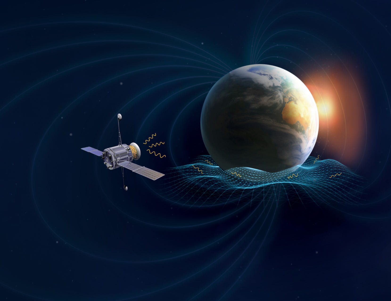 图:行星磁层系统探测高频引力波示意图(左);低轨道地球卫星数据对随机高频引力波特征应变的95%置信水平上限(右)。