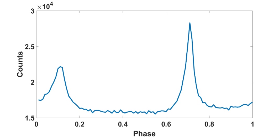 Crab脉冲星是颗强大的电磁辐射源,以33.8毫秒的周期快速旋转,并以很窄的波束辐射X射线光子,这些光子被FXT接收到,从而形成了我们看到的脉冲轮廓。FXT采用时变模式,可以获得脉冲星的精确的脉冲周期、相位和轮廓。