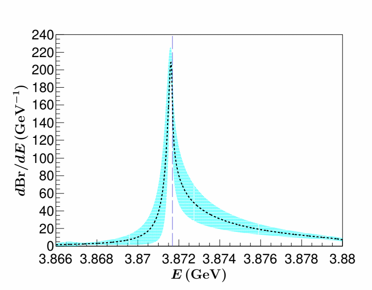 为深入理解X(3872)的结构,BESIII实验上开展了一系列研究,尤其是对它的共振态形状(line shape)的研究。由于X(3872)的质量正好位于粲介子对的产生阈值处,它的各个衰变过程之间有很强的耦合效应,所以很难通过单一过程正确地提取其各项参数信息。最近,BESIII合作组对它的两个主要衰变过程π+πJ/ψ进行了联合分析,克服了耦合效应难以分析的困难,首次得到了完整的共振态形状(图1)。研究结果表明在X(3872)的波函数中分子态占主导地位,但同时存在紧致的短程内核。这项研究对理解X(3872)粒子的结构具有重要的意义。