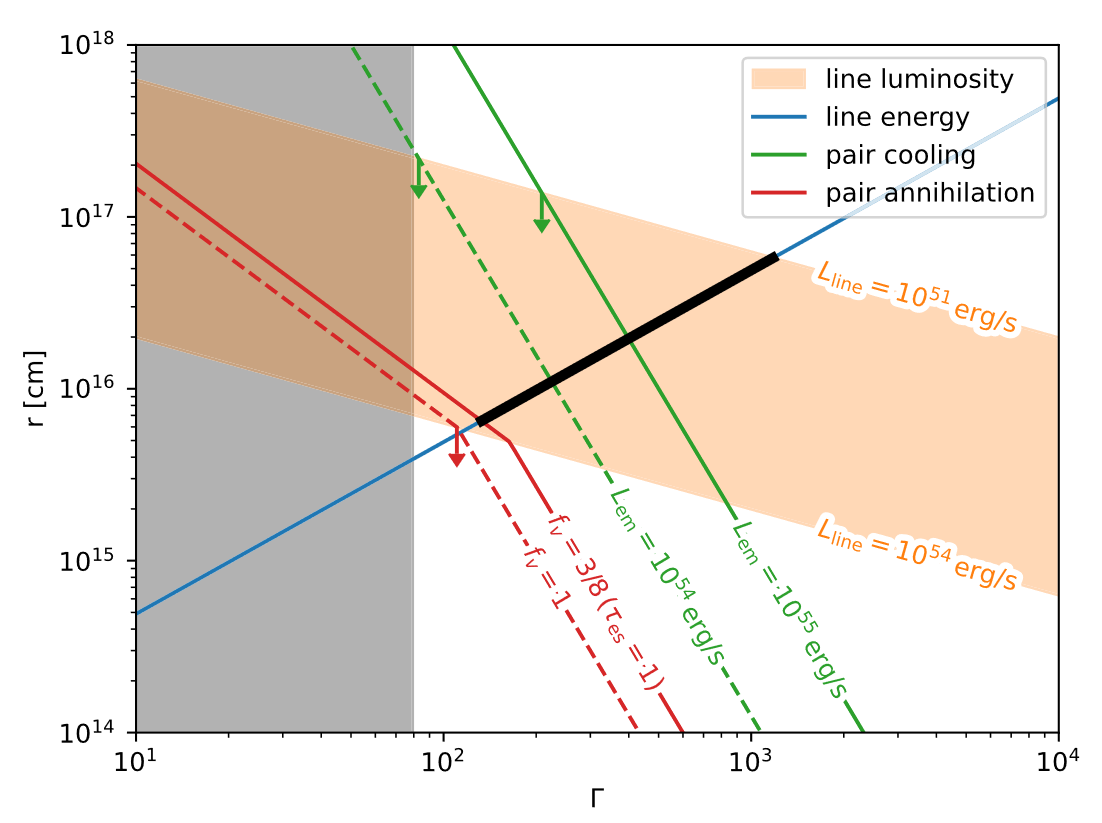 图3: 研究团队建立理论模型解释伽马谱线观测结果,对喷流速度(洛伦兹因子Γ)和辐射区尺度(半径r)进行严格限制[2]