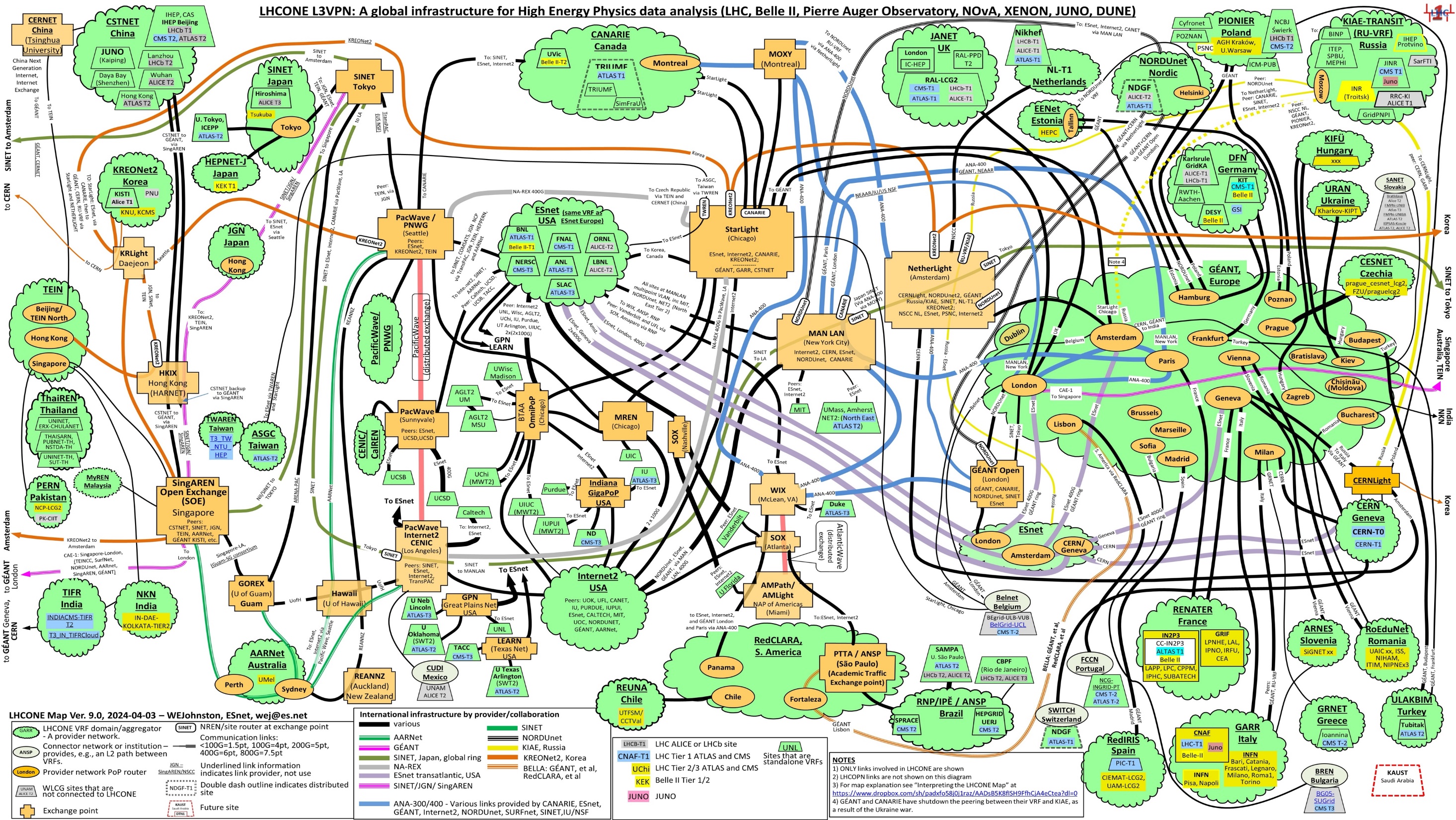 大型强子对撞机开放网络(LHCOPN-LHCONE)旨在通过新型网络技术,联合全球科研教育网络,为高能物理机构及其数据中心提供高效、安全和可靠的全球数据交换能力,以满足高能物理科学家对海量科学数据的访问和共享需求。LHCOPN是支撑LHC数据网格的一级数据中心(Tier-1 Center)专用高速网络,连接全球17个零级和一级数据中心,用于大规模数据传输共享。LHCONE则是连接全球超过100个LHC数据网格二级数据中心(Tier-2 Center)虚拟专用网络。LHCOPN-LHCONE通过网络互信技术,消除防火墙等网络管理的瓶颈,提高数据交换的效率。长期以来该专用网络在支撑数据共享和科学计算方面取得巨大成功,因此国际上一批非LHC的大科学装置实验也加入该开放网络,包括江门中微子实验JUNO,平方公里射电望远镜阵列SKA,日本粒子物理实验BELLEII等。