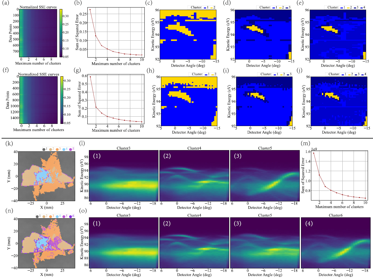 图1:多阶段聚类算法(MSCA)实现动量空间能带的抓取(c-e,h-j)与实空间不同电子结构区域的划分(k,n)。