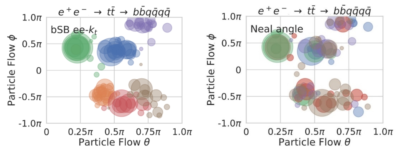 图1:显示来自ttbar事例,其中喷注由bSB算法重建(a),或者使用既往研究的距离定义进行模拟退火算法(b)。每个圆圈代表一个粒子流候选,其大小与能量成正比。每种颜色对应一个单独的喷注。