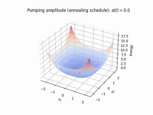 图2:演示模拟分岔算法求解简单的两个自旋Ising模型,其中x和y轴表示两个自旋变量的值,z轴表示能量。