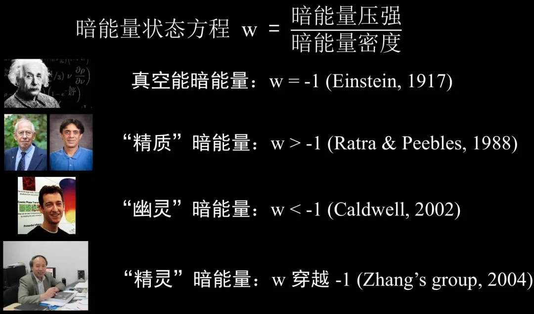 暗能量的物理本质是什么?这是新世纪的一个重大疑难。在过去的几十年,国内外科学家提出了多种理论来诠释暗能量。描述暗能量物理属性的一个重要量是它的状态方程 w (即压强与能量密度之比),不同的暗能量模型唯象上可通过状态方程w的演化行为来分类(见图二)。比如,对于宇宙学常数来说,w不随时间变化并且 w = -1。对于动力学暗能量模型来说,w是随时间而变化的,但不同模型预言的变化区间不一样:Quintessence(译为精质)理论预言w > -1,Phantom(译为幽灵)理论预言w < -1,而Quintom(译为精灵)理论则预言w在宇宙演化过程中穿越-1。