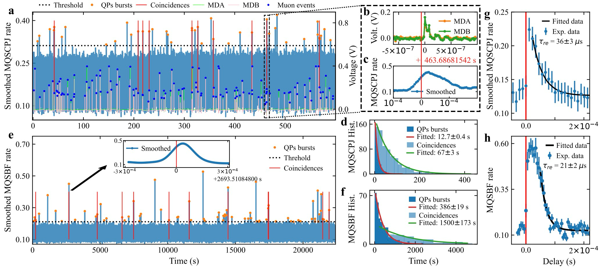 (a) 连续监测多比特同时电荷-宇称翻转事件的时间序列。(b), (c) 典型重合(同时发生)事件的时间片段,同时显示为峰值的MDA和MDB电压被识别为μ子事件。(d) MQSCPJ实验中相邻重合事件之间的时间间隔直方图。 (e)与(a)类似,使用的是监测多比特同时翻转(MQSBF)方法来识别关联错误事件。(f)与(d)类似。(g),(h) 展示了MQSCPJ和MQSBF速率的平均动态过程,并拟合得到关联错误发生的时间长度分别为 36±3 µs 和 21±2 µs。