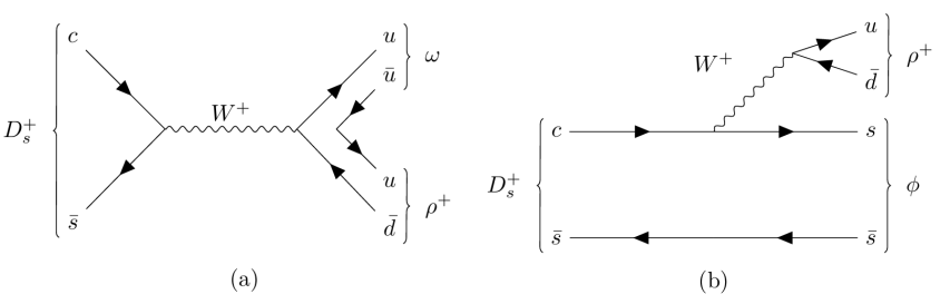 在粲介子衰变中,末态为两个矢量介子衰变被认为是寻找超出标准模型的新物理及研究强子结构的重要过程。理论认为此类衰变由横向极化主导,波成分作为主要贡献存在。然而,现有实验表明,部分该类衰变过程由纵向极化主导,并观测到 波或 波主导的反常现象,这与传统理论预期产生了严重不符,并以“极化难题”为名在物理学家中受到广泛讨论。目前,物理学家常使用拓扑图方法研究该类过程,而纯W-湮灭过程Ds+→ωρ+和纯W-外发射过程Ds+Φρ+是研究“极化难题”的重要研究对象。二者的拓扑图如图1所示。