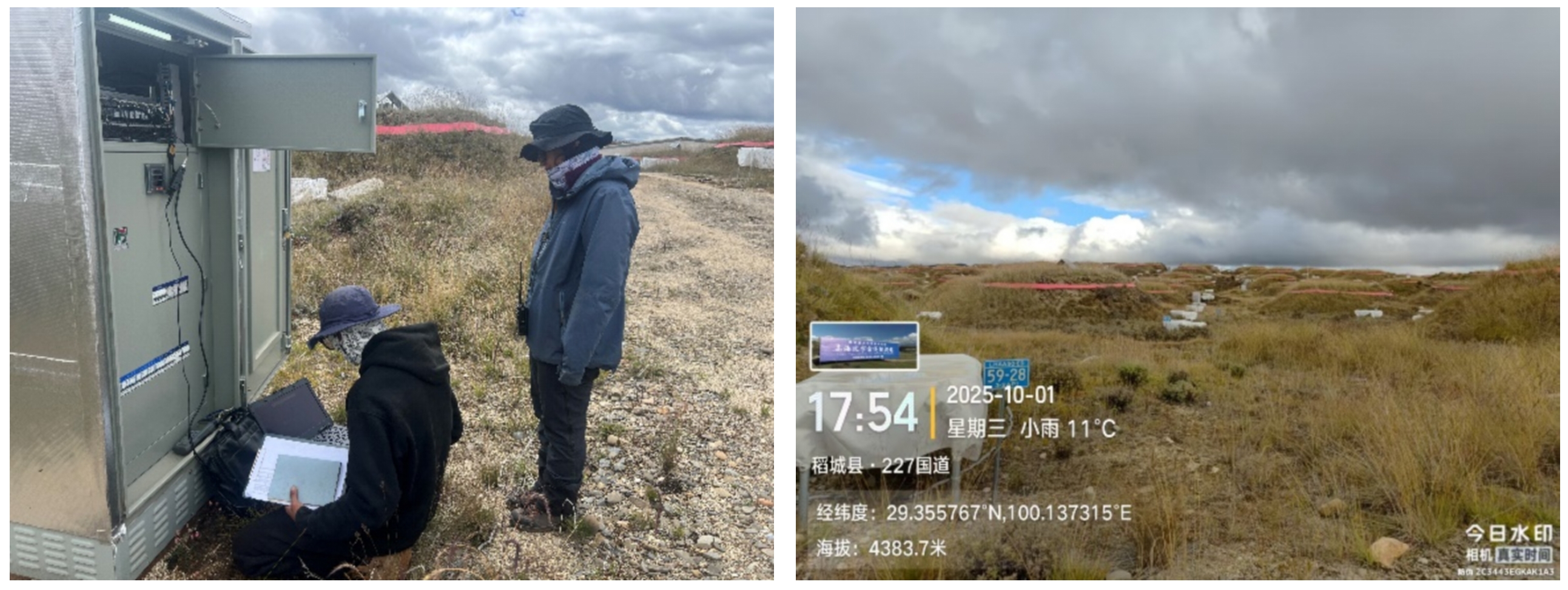 左:现场人员四朗电珠和泽仁配合刘佳研究员进行ED探测器交换机检查  右:LHAASO现场照片