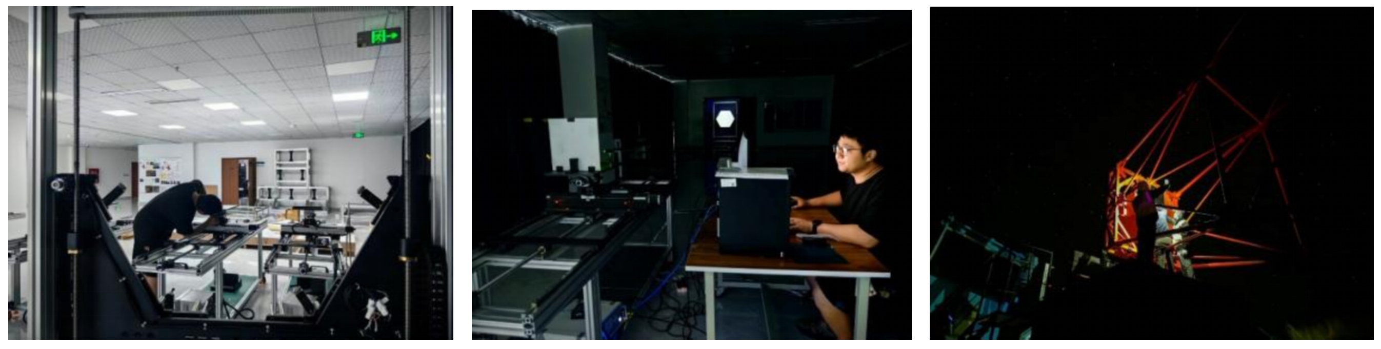 左一、二:为第二台望远镜建设进行的反射镜实验室光学性能测试  右:首台望远镜现场机械系统维护与调试