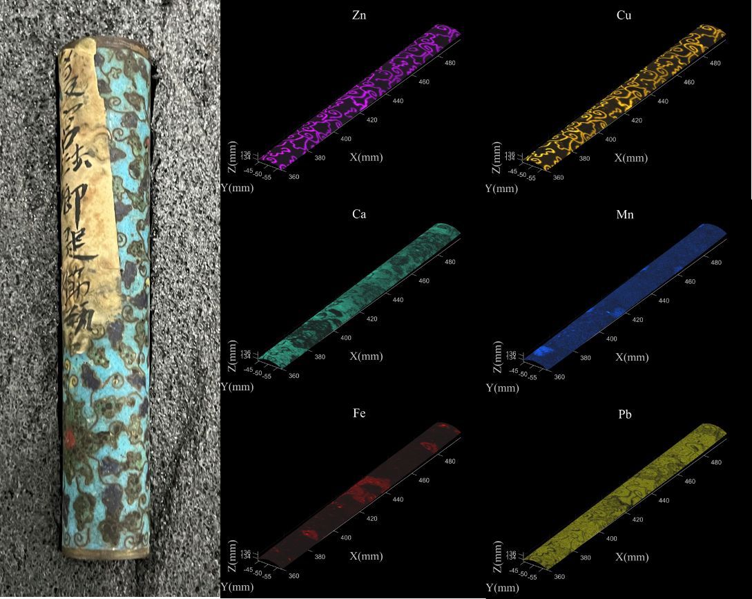在此背景下,研究团队研发了一种表面自适应的微区X射线荧光光谱仪。该光谱仪集成了六轴机械臂与深度相机,具备对表面不规则文物进行高精度大面积自适应扫描的能力。其可实现三维轮廓捕获与路径规划,确保扫描中X射线始终垂直入射且工作距离恒定,并实时生成文物表面三维元素分布图。设备同时支持平面、曲面及360°环形扫描模式,适用于各类复杂形状文物。其开放式可移动设计突破了传统微区X射线荧光光谱仪对物体尺寸和扫描环境的限制,便于考古现场的原位分析。该设备目前已针对各类表面不规则文物进行了三维无损元素分析,在对故宫博物院的珐琅筒进行的曲面扫描实验中,研究团队利用该设备进行了高分辨率快速扫描,在不清除附着在珐琅筒表面纸张的前提下,以150微米的精度还原了纸张下的珐琅筒表面元素分布(图2)。除金属文物外,该研究团队针对古建筑表面脱落的彩绘易碎且维持古建筑表面轮廓等特点,在不展平彩绘的情况下,对原始的弯曲彩绘进行了大面积曲面扫描,展现了传统微区X射线荧光光谱仪不具备的大面积曲面扫描能力。在山西陶寺考古现场,研究团队利用该设备对套箱内的圭尺进行了原位扫描,并根据得到的三维元素分布,清晰的还原了圭尺表面彩绘图案。