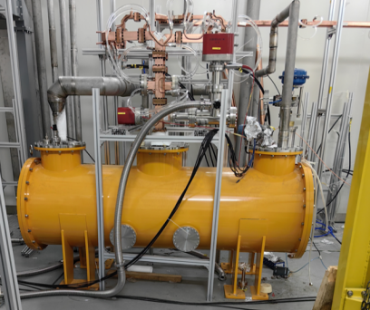 这一核心性能指标于2025年11月24日在中国散裂中子源(广东东莞)的高功率测试中得到验证。测试数据显示,该加速结构在77K低温工况、输入功率32.45 MW、脉冲宽度2.5μs条件下,加速梯度达到128.5 MV/m。由中国科学院上海高等研究院、中国科学院近代物理研究所、北京大学、中国科学技术大学等单位7位专家组成的测试组,现场确认了这一突破性成果。本课题的顺利开展得益于多个团队的合作,包括加速器中心射频超导与低温组、机械组,以及东莞研究部直线射频组与低温组。高能所东莞研究部在测试场地、配套设备等方面提供了有力支撑,为实验顺利开展提供了坚实保障。