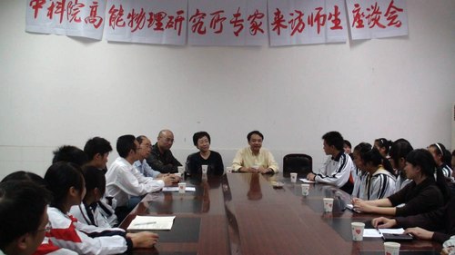 颁奖大会后,王贻芳等一行还参加了马边中学学生代表座谈会,与同学们进行了面对面的交流,并与同学们就如何排除社会上不良现象的干扰,如何克服困难努力学习,怎样树立正确的人生观和长远的奋斗目标,怎样看待科学与环保、发展与和谐以及一些具体的学习方法问题进行了热烈诚恳的探讨。