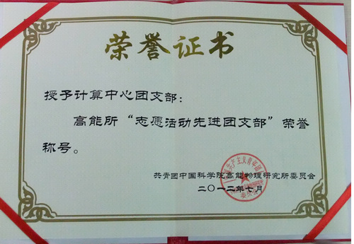 计算中心团支部积极响应所团委关于开展青年志愿活动的号召,结合中心的工作特点,团结中心青年,积极调动青年积极性,在近五年的时间里举办了大量的志愿活动。在所纪念建团90周年团员大会中被授予“志愿活动先进团支部”荣誉称号。