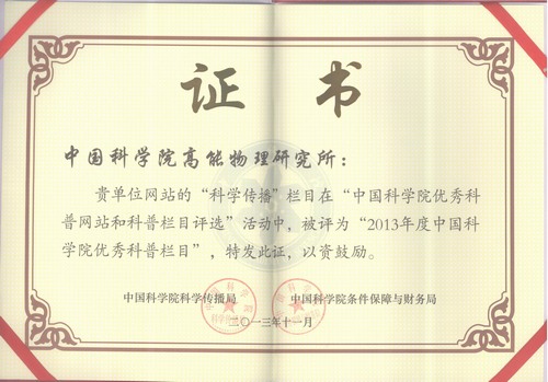 11月25日至26日,中国科学院2013年科普工作研讨会暨网络科普培训会在北京召开,会上对中科院2013年度优秀科普网站、优秀科普栏目及提名栏目进行了表彰,高能所网站科学传播栏目荣获优秀科普栏目。