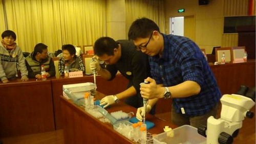 质粒抽提,队员胡海岱熟练的操作技术更是第一个在30min内成功完成了抽提质粒的任务。