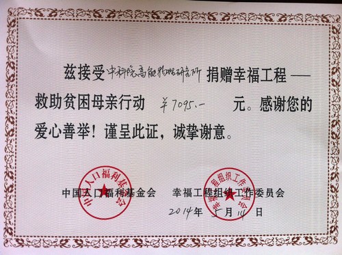 2014年是中央国家机关人口和计划生育委员会组织开展“幸福工程——救助贫困母亲行动”的第17年。多年来,幸福工程把爱心者的奉献与弱势群体的需求有机地结合在一起,共同营造了幸福与和谐的社会氛围。高能所干部职工在20145向实行计划生育的贫困母亲献爱心的捐款活动中共计捐款7095元,全所共有194人在19个部门的计划生育宣传员的组织下积极参加了此次活动,为救助贫困母亲、扶助计划生育困难家庭做出贡献。514日,所计生办已将募捐款项交到中科院人口和计划生育委员会办公室。