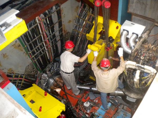 为确保谱仪西端部量能器能够如期完成检修工作,高温假期间通用运行部维修组的全体人员及室领导仍然坚守在工作岗位上。此次检修任务由通用运行部和实验物理中心人员负责西端部量能器移动机构的现场装配以及从谱仪拉出西端部量能器。端部量能器移动机构由下支架、上支架、移动机架及其配重组成,每一件工装尺寸都比较大,由于是首次安装,需要现场局部修整和配做工装,而且谱仪西边空间狭小,再加上受天车行程的限制,西端部量能器移动机构的安装非常困难。尽管如此大家还是迎难而上,在工装的安装过程中做到一丝不苟,认真按照操作规程来做,经过9天的努力终于完成了移动机构的安装,并于87日把西端部量能器顺利拉出了谱仪,为下一步实验物理中心检修西端部量能器TOF做好了准备,也为明年的谱仪大修积累了实战经验。