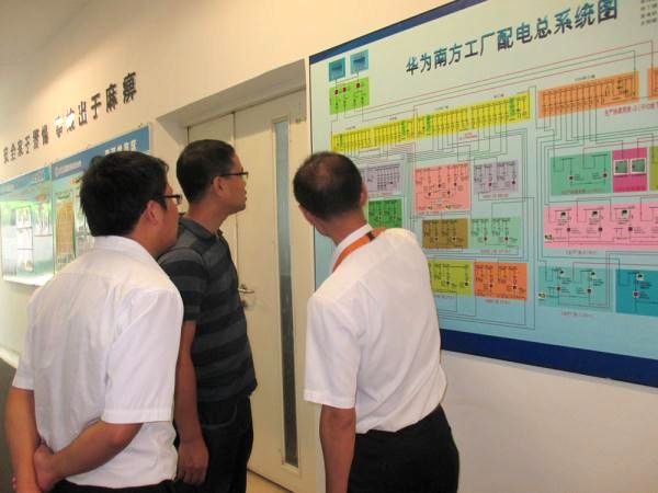 华为南方工厂动力设施部的技术人员介绍了他们的动力设施概况以及运行维护管理模式,CSNS技术支持部技术人员根据配电总系统图进一步了解相关情况。随后,双方人员参观了冷水机组、循环水泵房、变配电室、高压开关站、新风机房、监控中心等相关机房。最后,双方就动力设施的相关工作进行了交流,也对比了CSNS大型科研项目与现代化工业的华为南方工厂在动力设备生产需求的异同。