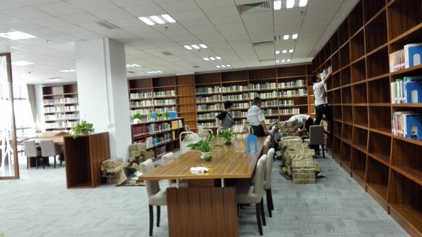 在高能所文献信息部的大力支持和指导下,由东莞分部党政办牵头组织和落实了分部图书馆建设的各项事宜。分部图书馆建设始于2014年6月,通过实地调研,确定了建设方案和施工单位,于2014年12月正式投入现场施工,2015年2月图书馆的硬件设施基本安装完毕,2015年6月底经过加固修缮和色差调整后完成了施工验收,通过开窗通风、绿植净化等现已达到投入使用的要求。