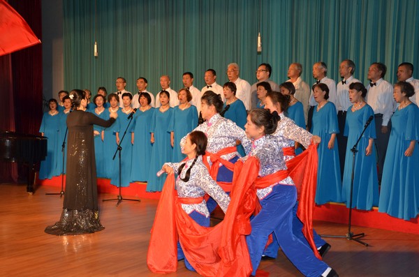 参与这次演出活动的高能所离退休人员约50余人,为了给纪念中国人民抗日战争暨世界反法西斯战争胜利70周年献礼,他们精心选择曲目、加班加点刻苦训练,以最佳的节目阵容、最好的表演效果表达出老同志的心愿。在离退办的积极努力下,老年合唱团、时装队、舞蹈队通力合作,高能所上报的节目顺利通过院机关审查。以《松花江上》、《卢沟谣》、《保卫黄河》构成的表演唱精彩恢弘、气势磅礴,为整场演出拉开序幕,唱出了气势和气魄,老同志们的精彩表演激情飞扬,博得了全场观众的掌声和好评。