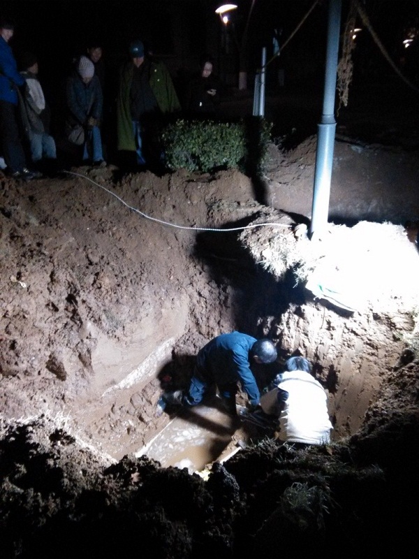 由于自来水管道是直埋敷设,跑出的水从电缆管道流走,未从地面渗出。因地下土质非常坚硬,挖至渗水处10公分处看不到水迹,使得管道漏水点不易判断,给抢修工作带来很大困难。且故障点靠近摄像头杆,给修复工作增加了难度及不安全因素。