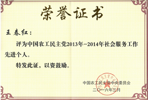 王春红获评农工党中央“2013年-2014年社会服务工作先进个人”荣誉称号