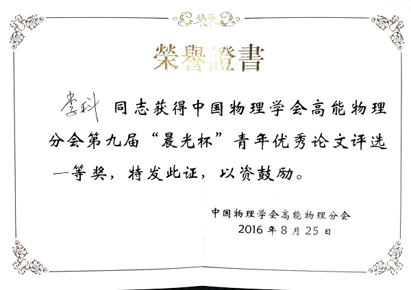 高能物理分会每两年举办一次青年优秀论文评选活动,参评对象是从事高能物理事业(包括粒子物理理论和实验、中高能核物理、宇宙线和高能天体物理等)工作的35岁以下的青年科研人员。 经过17位专家初评,入围的论文作者在全国粒子物理学术会议上报告论文成果,经10位终评评委无记名投票选出“晨光杯”青年优秀论文获奖者。 本次共评选出一等奖三名,二等奖六名。北京谱仪III实验在2013年发现至少含四个夸克的奇特强子态——带电类粲偶素Zc(3900)和Zc(4020), 在国际上引起极大反响。此后,BESIII实验又在上述论文中报道观测到两个奇特强子态X(3872)和Y(4260)之间可能存在关联。该成果发表后得到国际同领域专家高度评价,推动了对这些奇特态粒子性质的深入研究。
