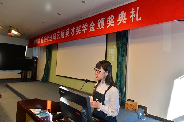 山东大学的崔瀚化代表获奖同学发言,她感谢母校和高能所共建的英才班对她的培养,未来她将更积极的投身到学习和科研中去,取得更好的成绩。