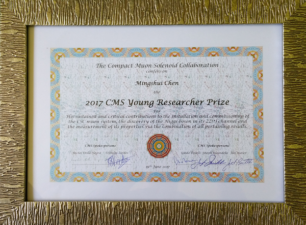 6月19日,在欧洲核子研究中心(CERN)举行的2017年CMS (Compact Muon Solenoid) 国际合作组年会上,CMS合作组颁发了2017年度青年研究员奖(Young Researcher Prizes)。中科院高能所陈明水研究员因在"缪子探测器的安装调试、希格斯粒子的发现及其性质测量”中的重要贡献而获奖。他的奖状表彰了他对CMS实验的杰出贡献:For His sustained and critical contributions to the installation and commissioning of the CSC muon system, the discovery of the Higgs boson in its ZZ(*) channel and the measurement of its properties via the combination of all pertaining results.